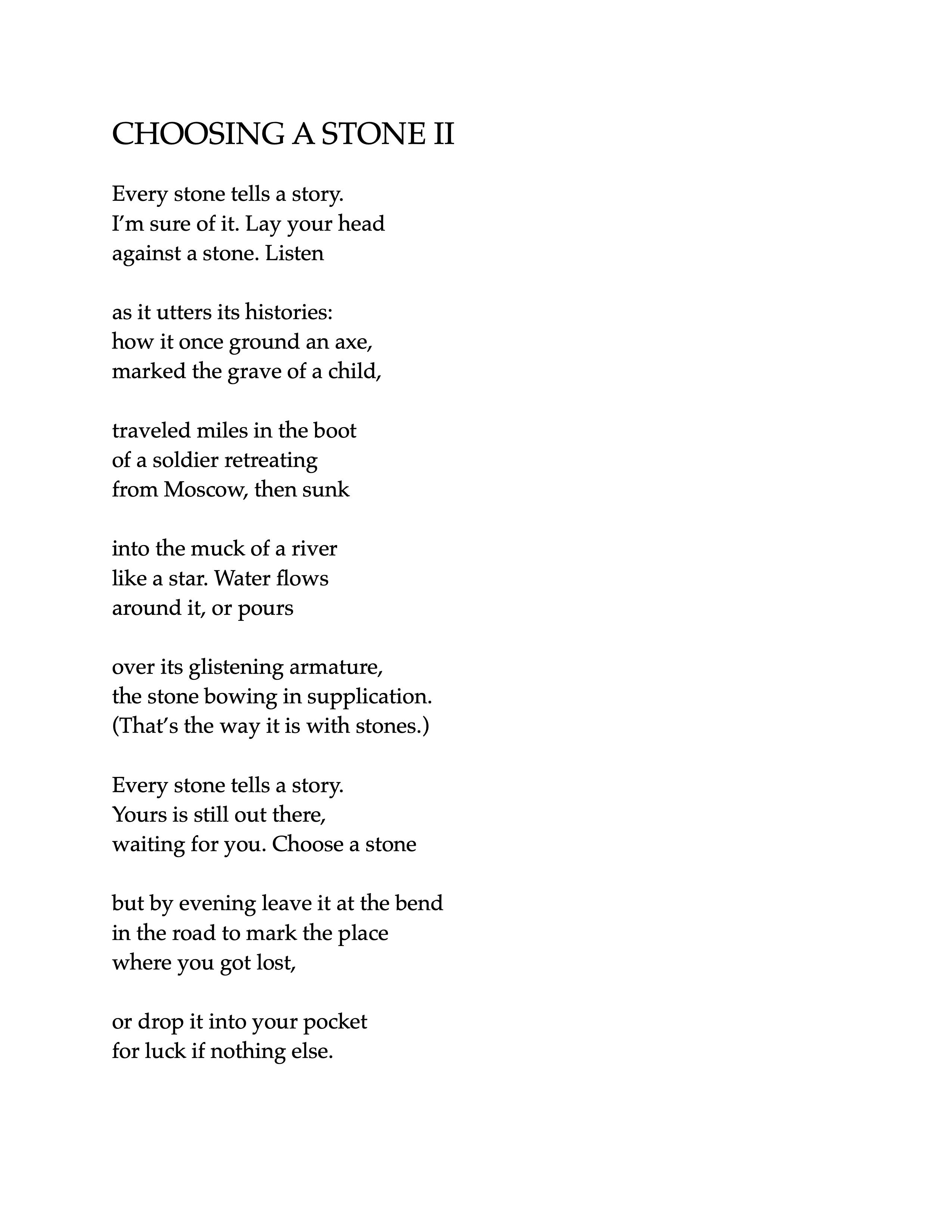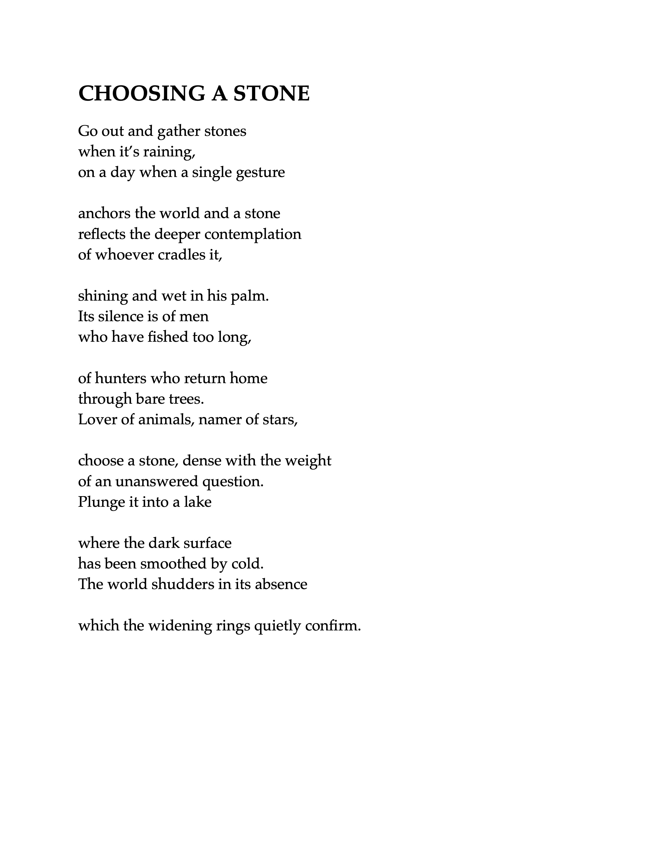 The poems in Choosing a Stone, Hedderman’s first full-length poetry collection, masterfully explore the intersection of physical landscape and human consciousness. In sharply imagistic and muscular language, these visceral poems revel in the sensory delights that reinforce our shared humanity: praising hot black coffee, savoring a rustic Basque dinner, lazing in a hammock, or watching “the sky-map of cloud drift over the trees.” He is archeologist and alchemist, quarrying an historical mythos to shape his powerful, deeply-realized vision.